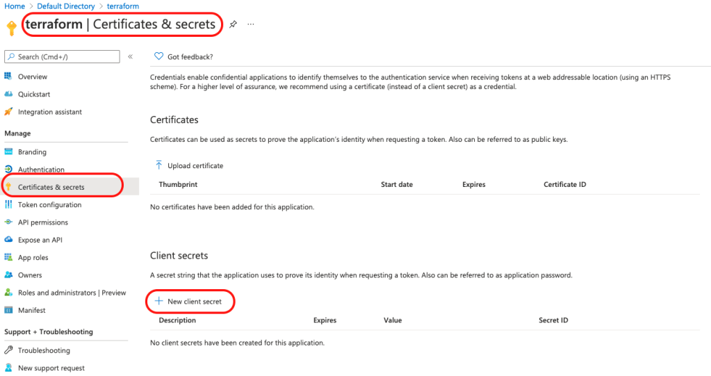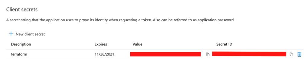 6. Copy the Secret ID and value and keep it safe. We will use it later for provisioning of resources with terraform