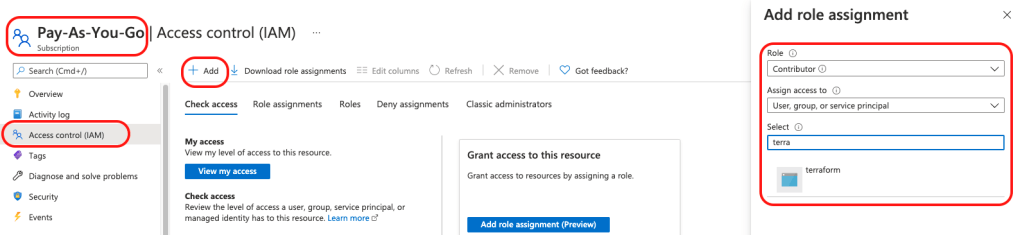 8. No we need grant this application access to subscription so it can create Azure resources. Navigate to you Azure subscription and then open Access control (IAM) blade. + Add > Add role assignment and grant contributor access to the terraform app and Save.