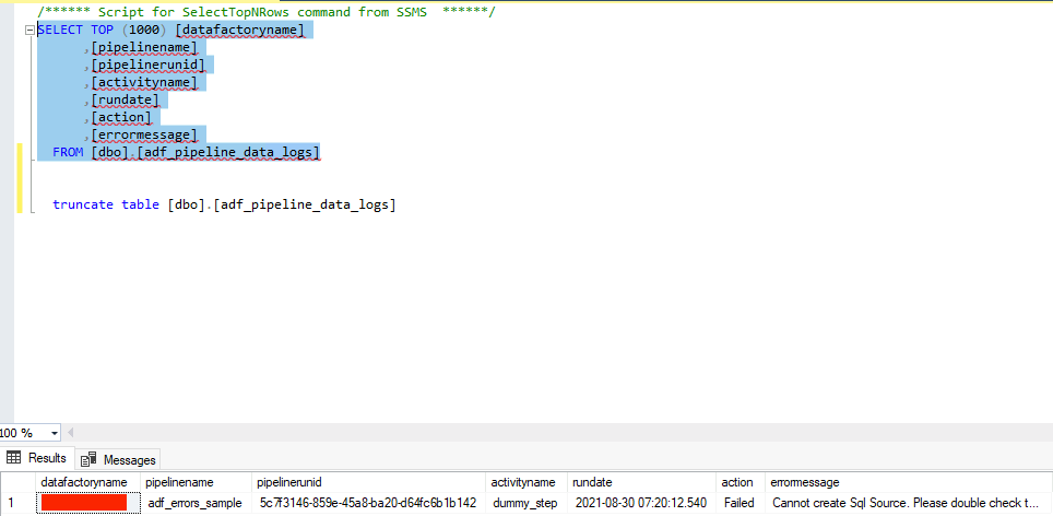 You will need the table schema and stored procedure to log the pipeline state to a custom table. Use the following SQL Script to create the required database objects in your monitoring database.