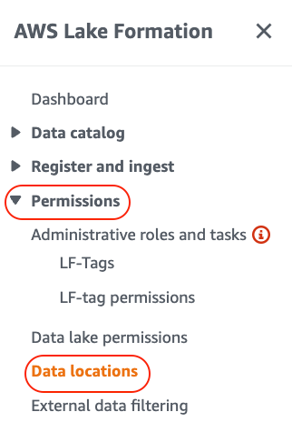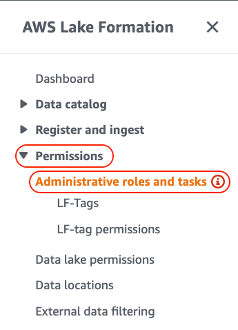 1. Navigate to the AWS Lake Formation and under the Permissions section choose Administrative roles and tasks