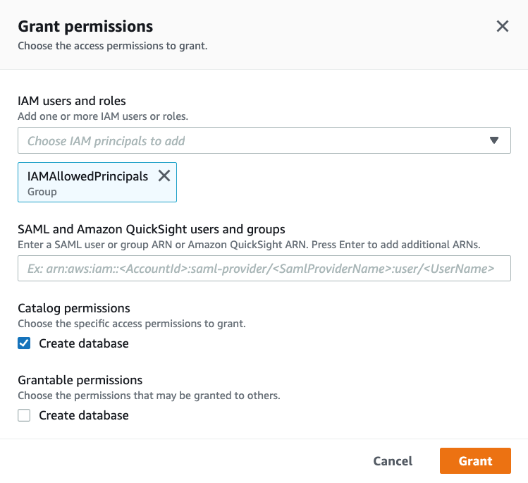 3. In the Data Creators section ensure that IAMAllowedPrincipals Group is granted Create database permissions