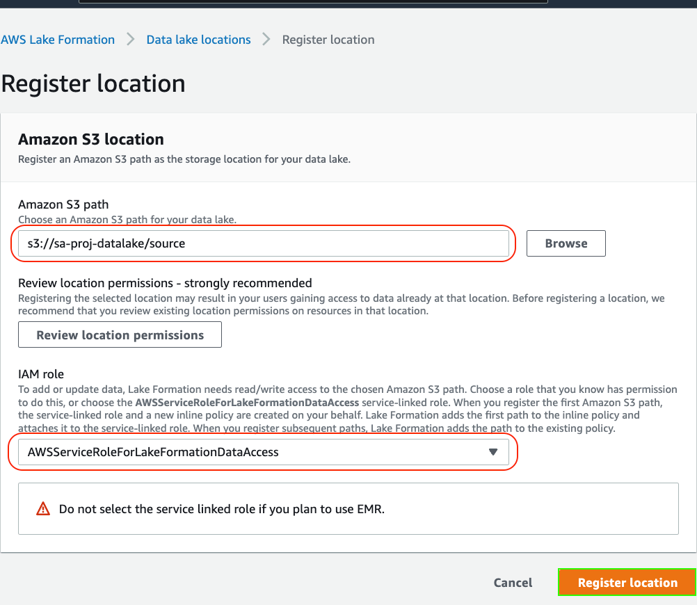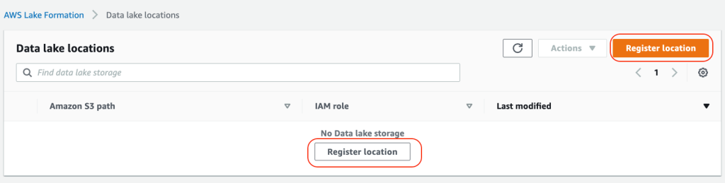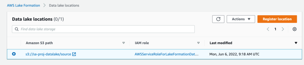 2. Choose Register location to include the S3 storage location as a part of the data lake