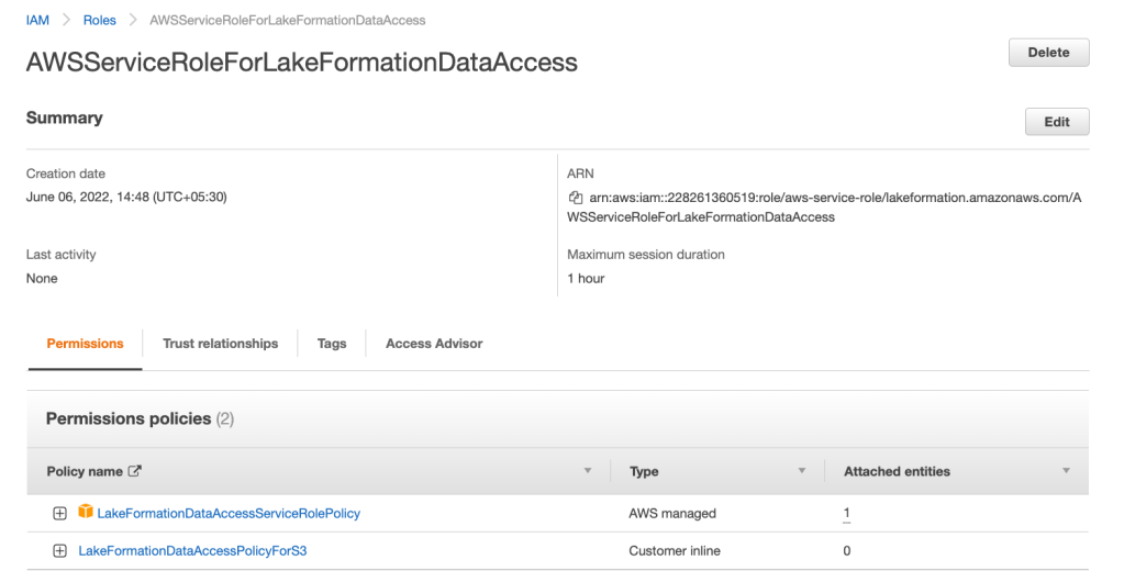 5. When we registered the location in Lake formation it automatically created the following inline policy and attached it to service linked role and this inline policy is managed by Lake Formation