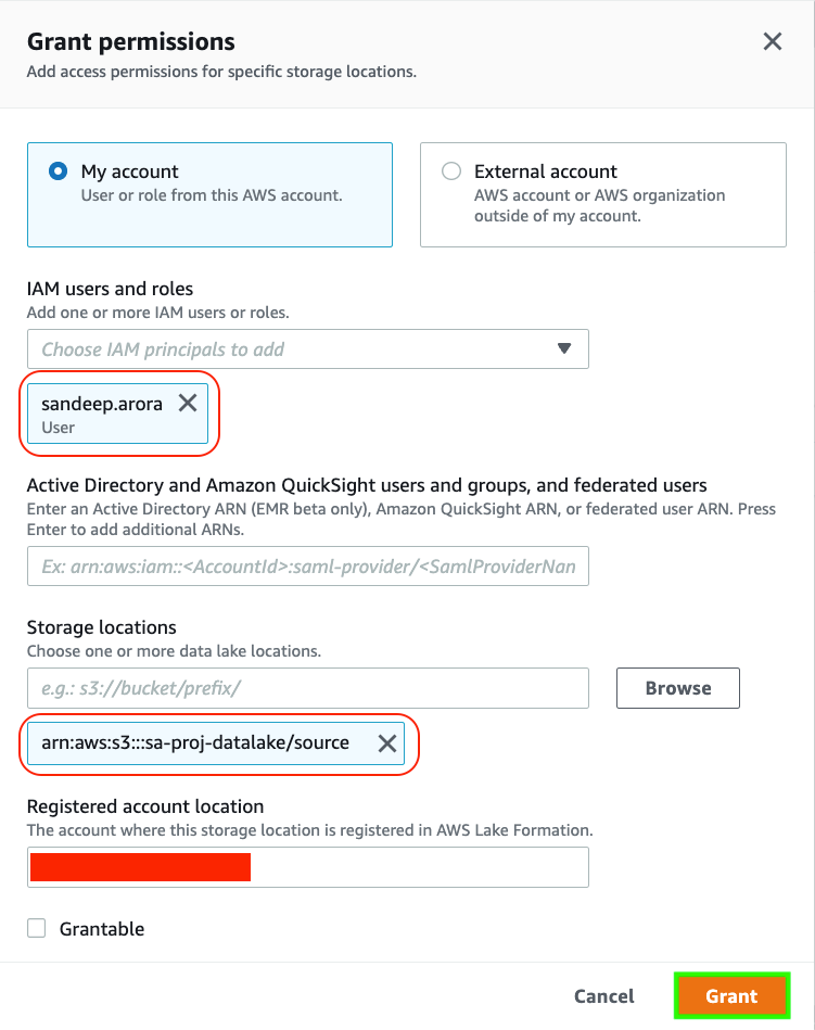 2. Lake formation allows you to manage access for users, roles, external accounts and etc. We are going to grant permissions to data location to current user