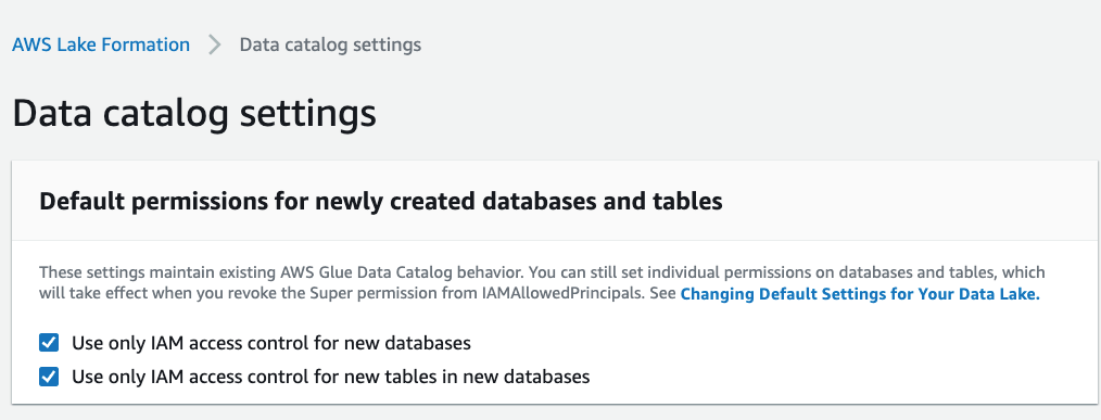 4. Validate permissions for databases and tables. Navigate to Data Catalog > Settings and check if IAM access control is enabled for databases and tables