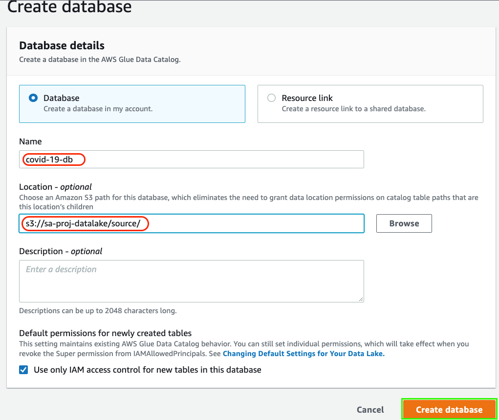2. Provide the source S3 location and database name as shown below and create the database