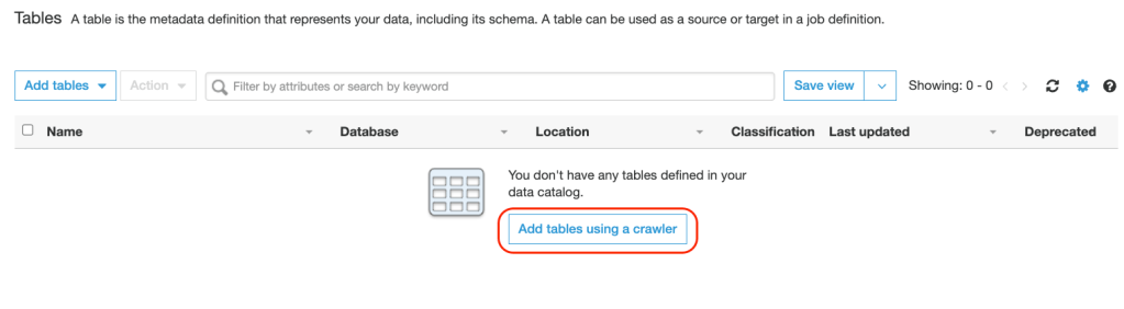 2. Add tables using a crawler and this will create a metadata tables in data catalog