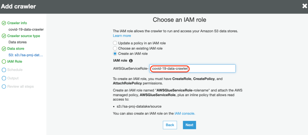 6. Create a new service linked role with necessary permissions to crawl the data source