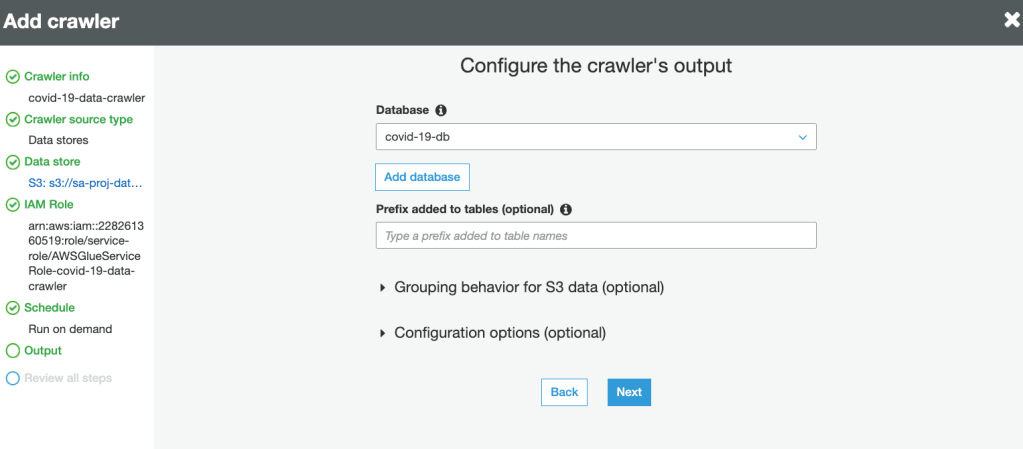 8. Select the database for crawler output. This is the same database created in Lake formation