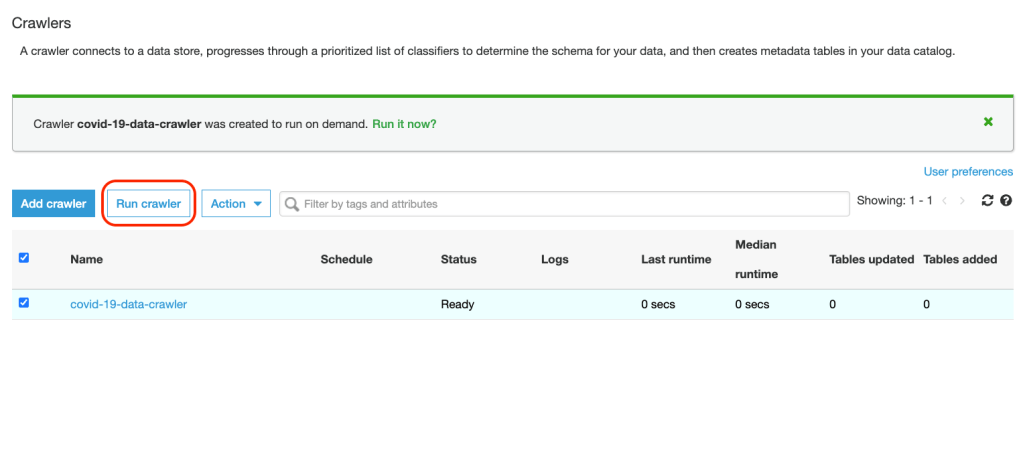 11. Wait for Tables added column (as shown below) to change to 1 and that would signal the completion of crawler task and table schema being updated in the catalog. Any tables updated or added by Crawler in the catalog are represented by these columns in the console.