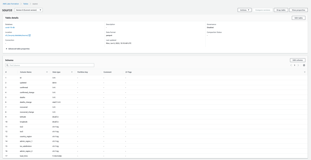 12. Navigate back to Lake formation and Data Catalog > Tables. The table should be been added by crawler and its schema must also be populated