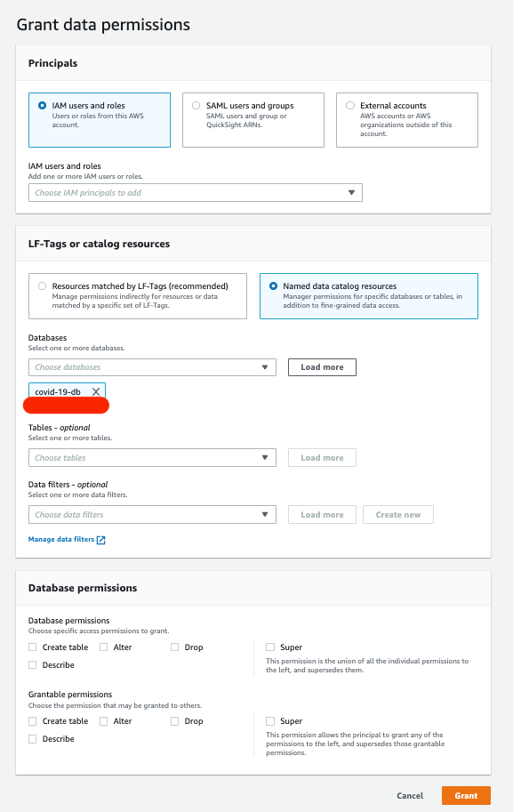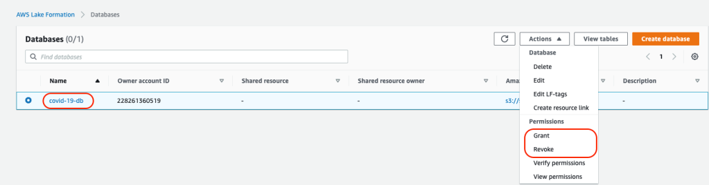 Database Level Permissions: You can grant or revoke permissions to IAM users or roles to databases in Lake formation using the console